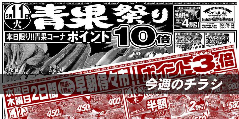 店舗情報 生鮮食品館 ベイ・はしば 守口市西郷通1-2-15 TEL. 6992-3155 営業時間 平日・土曜日・祝祭日:AM9:00~PM8:00 日曜日:AM9:00~PM7: