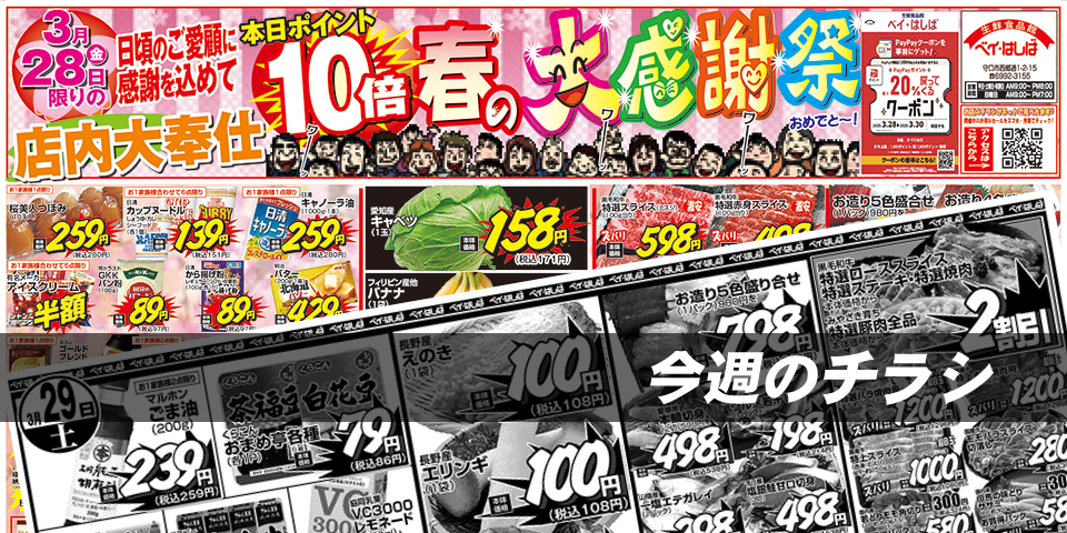 店舗情報 生鮮食品館 ベイ・はしば 守口市西郷通1-2-15 TEL. 6992-3155 営業時間 平日・土曜日・祝祭日:AM9:00~PM8:00 日曜日:AM9:00~PM7: