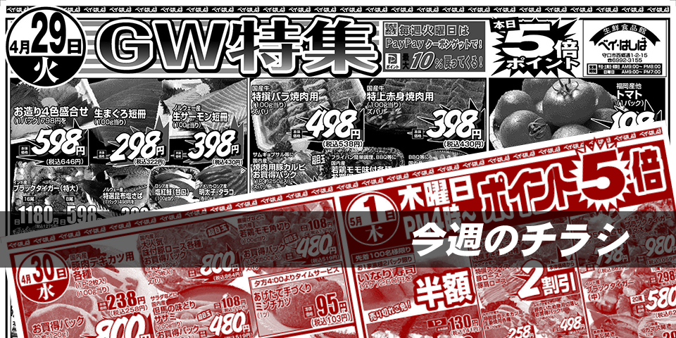 店舗情報 生鮮食品館 ベイ・はしば 守口市西郷通1-2-15 TEL. 6992-3155 営業時間 平日・土曜日・祝祭日:AM9:00~PM8:00 日曜日:AM9:00~PM7:
