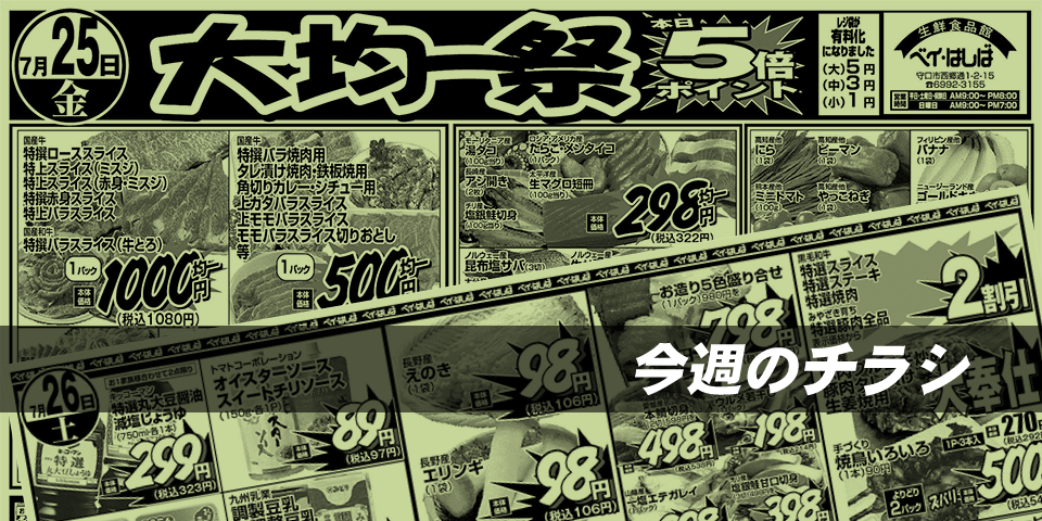 生鮮食品館 ベイ・はしば 守口市西郷通1-2-15 TEL. 6992-3155 営業時間 平日・土曜日・祝祭日:AM9:00~PM8:00 日曜日:AM9:00~PM7: