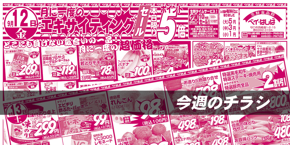 生鮮食品館 ベイ・はしば 守口市西郷通1-2-15 TEL. 6992-3155 営業時間 平日・土曜日・祝祭日:AM9:00~PM8:00 日曜日:AM9:00~PM7: