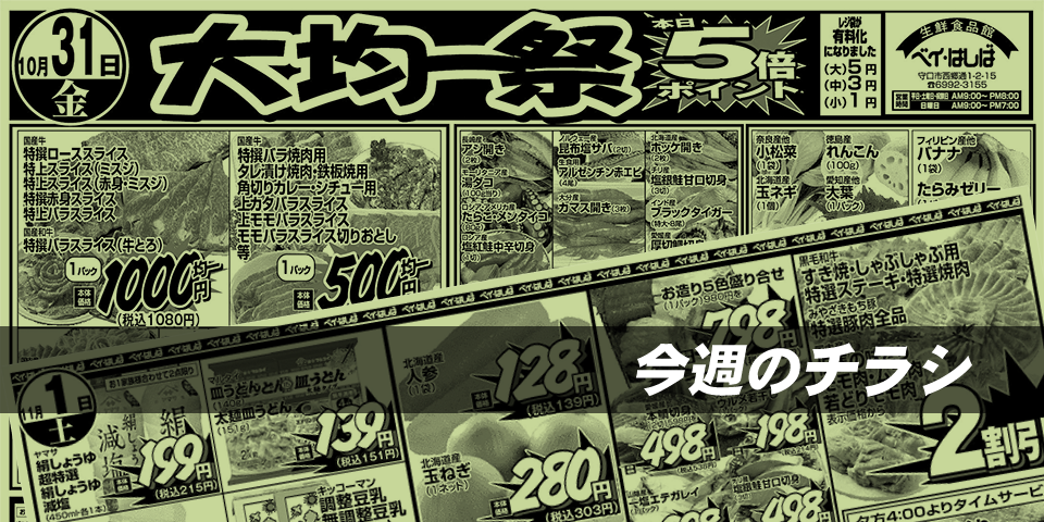 生鮮食品館 ベイ・はしば 守口市西郷通1-2-15 TEL. 6992-3155 営業時間 平日・土曜日・祝祭日:AM9:00~PM8:00 日曜日:AM9:00~PM7: