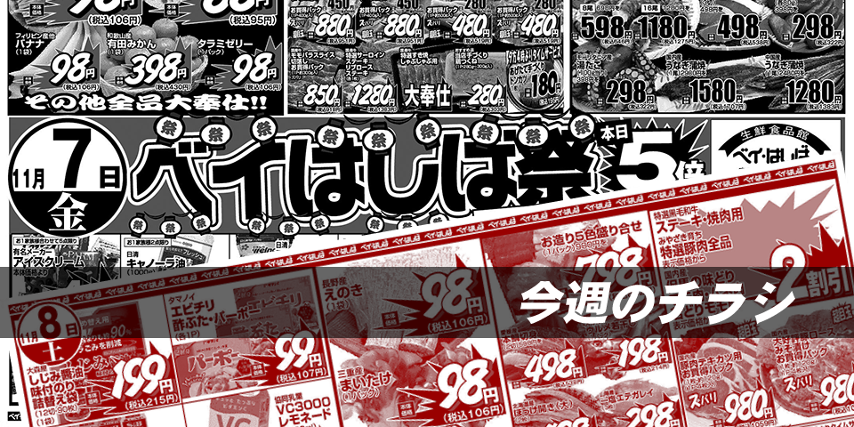 生鮮食品館 ベイ・はしば 守口市西郷通1-2-15 TEL. 6992-3155 営業時間 平日・土曜日・祝祭日:AM9:00~PM8:00 日曜日:AM9:00~PM7: