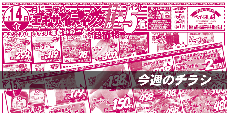 生鮮食品館 ベイ・はしば 守口市西郷通1-2-15 TEL. 6992-3155 営業時間 平日・土曜日・祝祭日:AM9:00~PM8:00 日曜日:AM9:00~PM7: