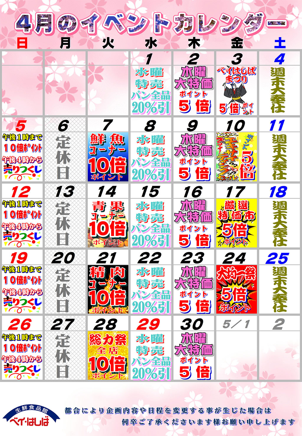 店舗情報 生鮮食品館 ベイ・はしば 守口市西郷通1-2-15 TEL. 6992-3155 営業時間 平日・土曜日・祝祭日:AM9:00~PM8:00 日曜日:AM9:00~PM7: