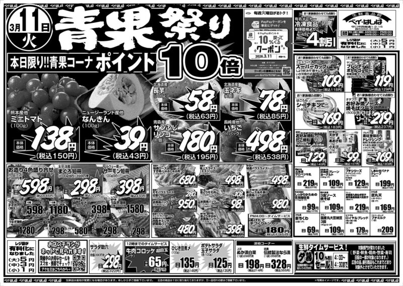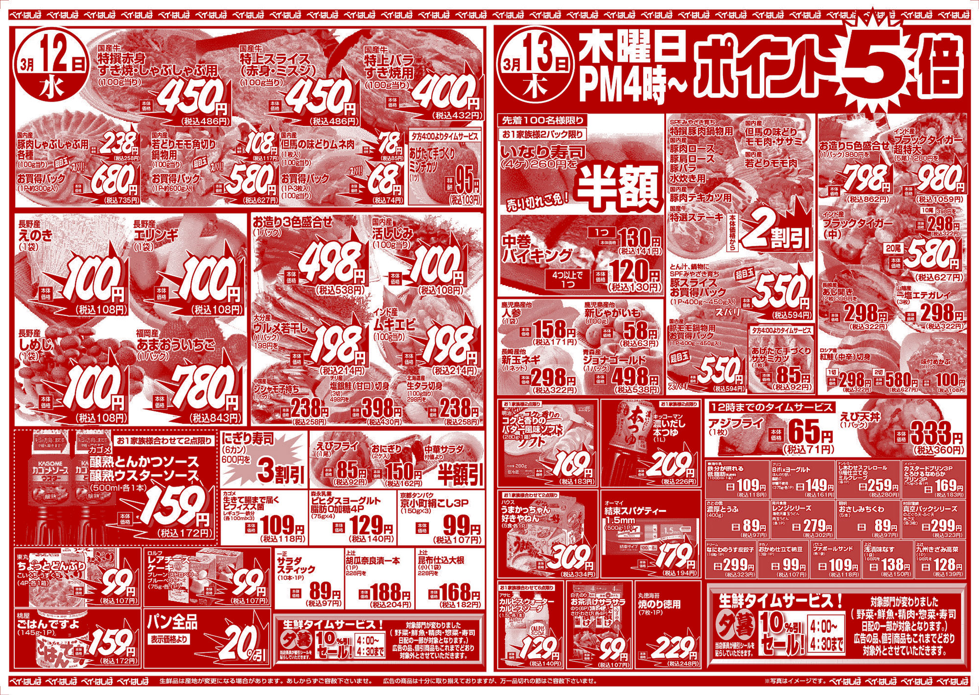 チラシ 今週のチラシ(2025年3月11日~3月13日) 投稿日:2025年3月9日 表面裏面 ※表面←→裏面を切り替えてご覧下さい。画像をクリックすると拡大表示になります。 ☆生鮮品は産地が変更になる場合があります。あしからずご容赦下さいませ。☆広告の商品は十分に取り揃えておりますが、万一品切れの節はご容赦下さいませ。※写真はイメージです。 -チラシ 執筆者:管理人
