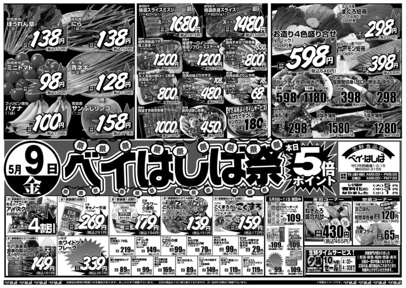 店舗情報 生鮮食品館 ベイ・はしば 守口市西郷通1-2-15 TEL. 6992-3155 営業時間 平日・土曜日・祝祭日:AM9:00~PM8:00 日曜日:AM9:00~PM7: