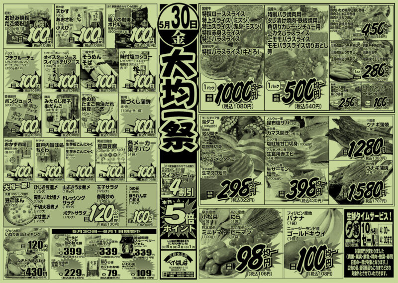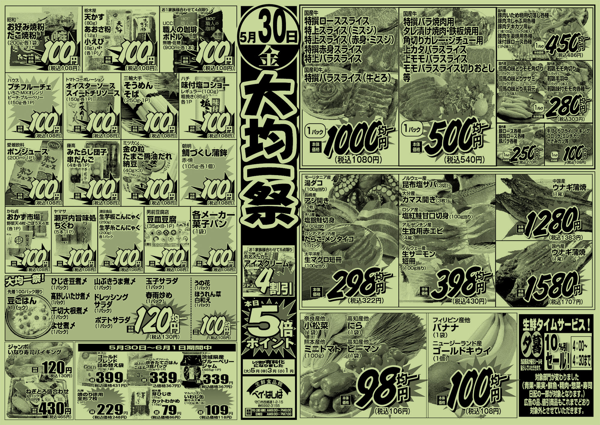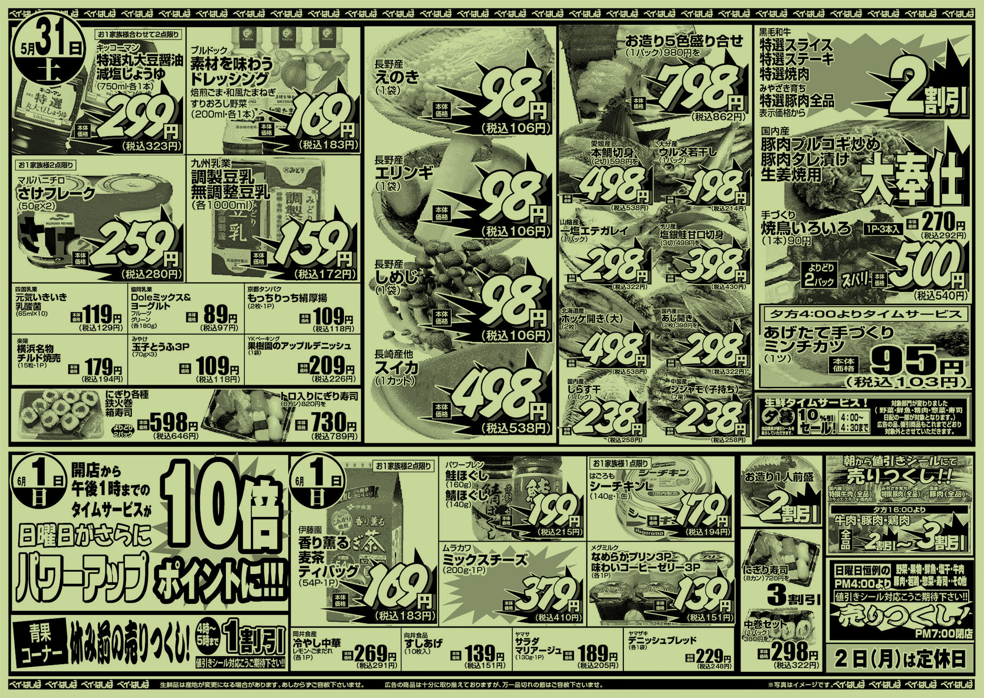 チラシ 今週のチラシ(2025年5月30日~6月1日) 投稿日:2025年5月29日 表面裏面 ※表面←→裏面を切り替えてご覧下さい。画像をクリックすると拡大表示になります。 ☆生鮮品は産地が変更になる場合があります。あしからずご容赦下さいませ。☆広告の商品は十分に取り揃えておりますが、万一品切れの節はご容赦下さいませ。※写真はイメージです。 -チラシ 執筆者:管理人