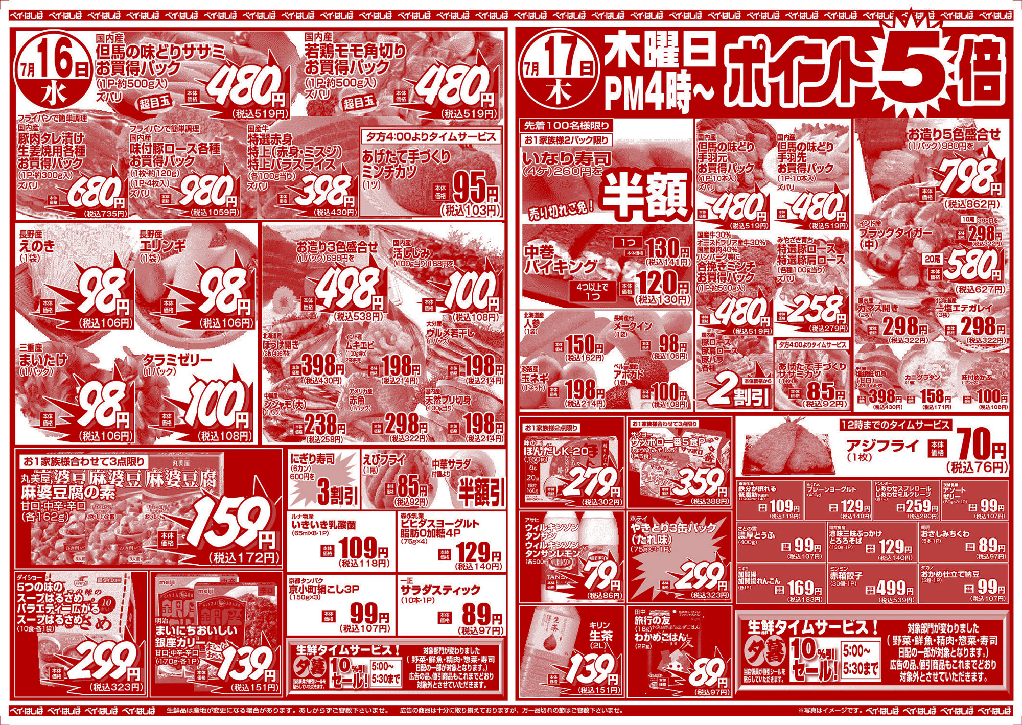 チラシ 今週のチラシ(2025年7月15日~7月17日) 投稿日:2025年7月13日 表面裏面 ※表面←→裏面を切り替えてご覧下さい。画像をクリックすると拡大表示になります。 ☆生鮮品は産地が変更になる場合があります。あしからずご容赦下さいませ。☆広告の商品は十分に取り揃えておりますが、万一品切れの節はご容赦下さいませ。※写真はイメージです。 -チラシ 執筆者:管理人