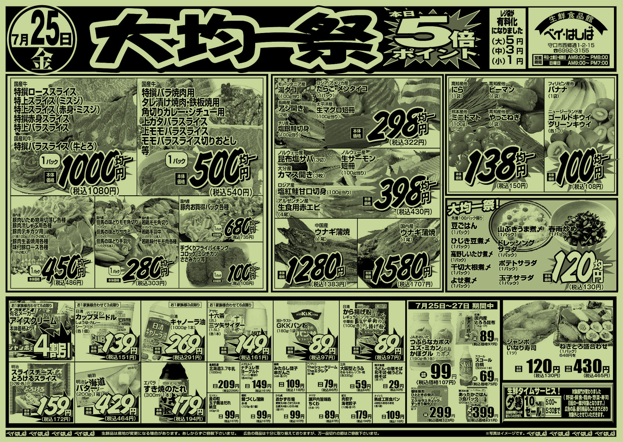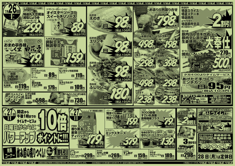 チラシ 今週のチラシ(2025年7月25日~7月27日) 投稿日:2025年7月24日 表面裏面 ※表面←→裏面を切り替えてご覧下さい。画像をクリックすると拡大表示になります。 ☆生鮮品は産地が変更になる場合があります。あしからずご容赦下さいませ。☆広告の商品は十分に取り揃えておりますが、万一品切れの節はご容赦下さいませ。※写真はイメージです。 -チラシ 執筆者:管理人