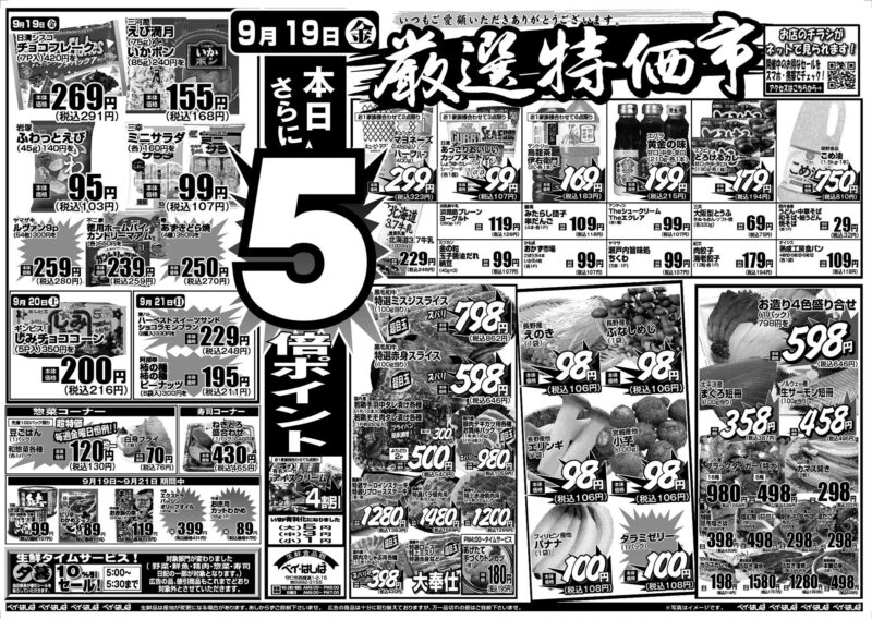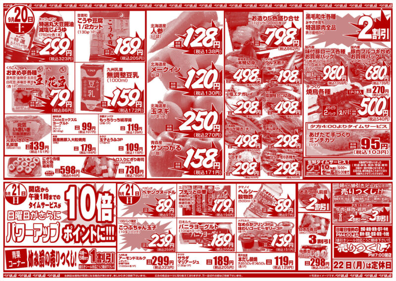 チラシ 今週のチラシ(2025年9月19日~9月21日) 投稿日:2025年9月18日 表面裏面 ※表面←→裏面を切り替えてご覧下さい。画像をクリックすると拡大表示になります。 ☆生鮮品は産地が変更になる場合があります。あしからずご容赦下さいませ。☆広告の商品は十分に取り揃えておりますが、万一品切れの節はご容赦下さいませ。※写真はイメージです。 -チラシ 執筆者:管理人