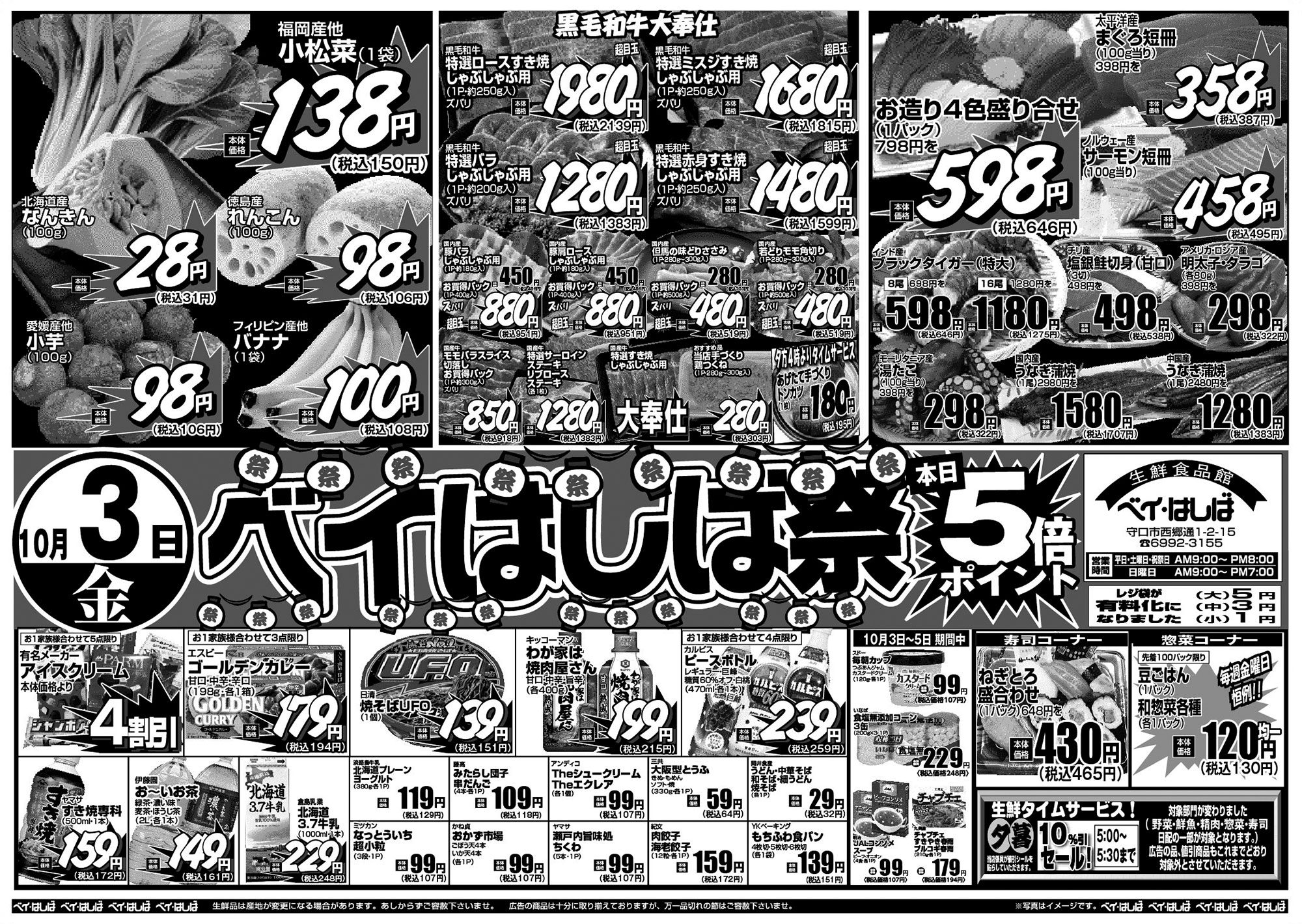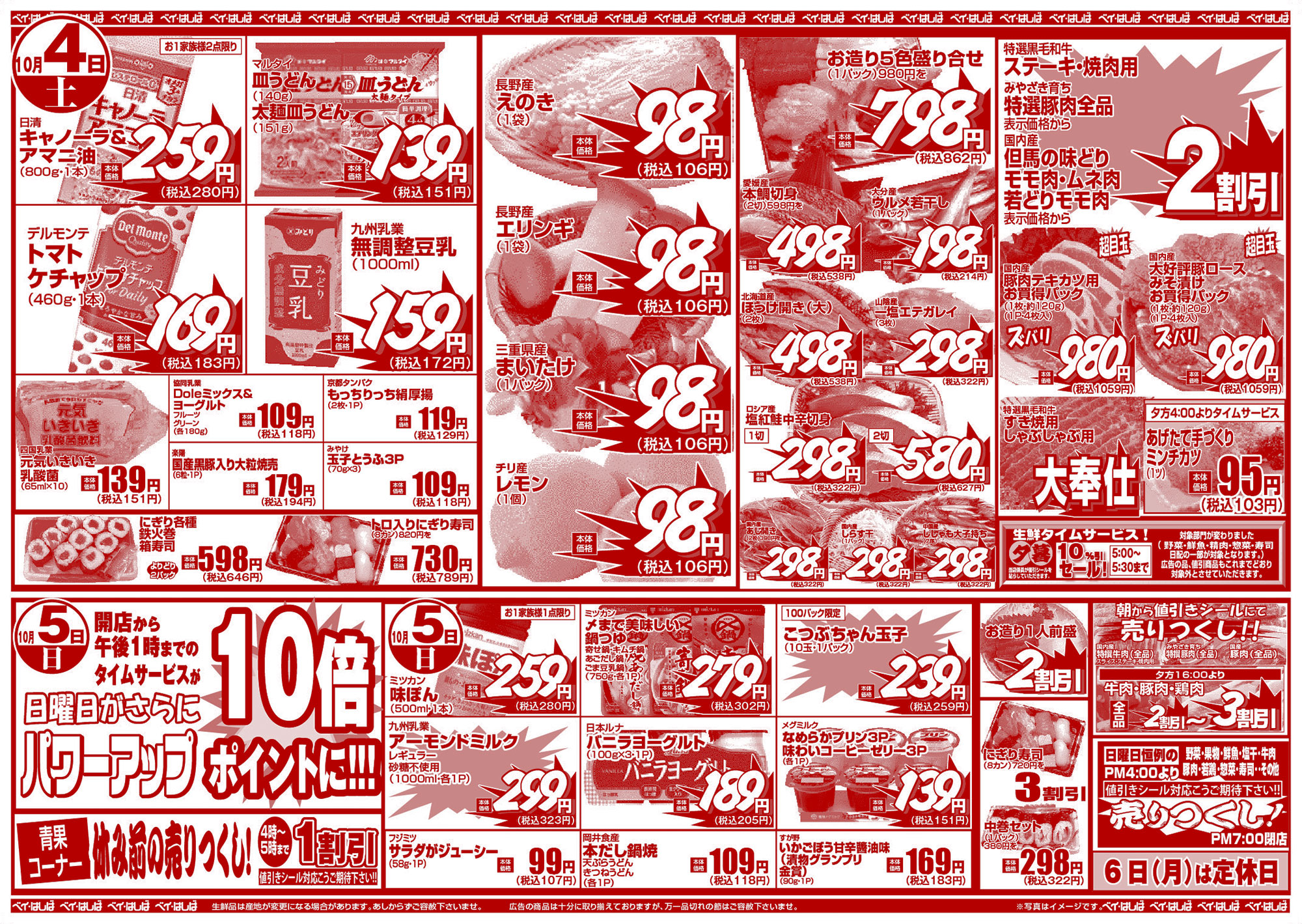 チラシ 今週のチラシ(2025年10月3日~10月5日) 投稿日:2025年10月2日 表面裏面 ※表面←→裏面を切り替えてご覧下さい。画像をクリックすると拡大表示になります。 ☆生鮮品は産地が変更になる場合があります。あしからずご容赦下さいませ。☆広告の商品は十分に取り揃えておりますが、万一品切れの節はご容赦下さいませ。※写真はイメージです。 -チラシ 執筆者:管理人