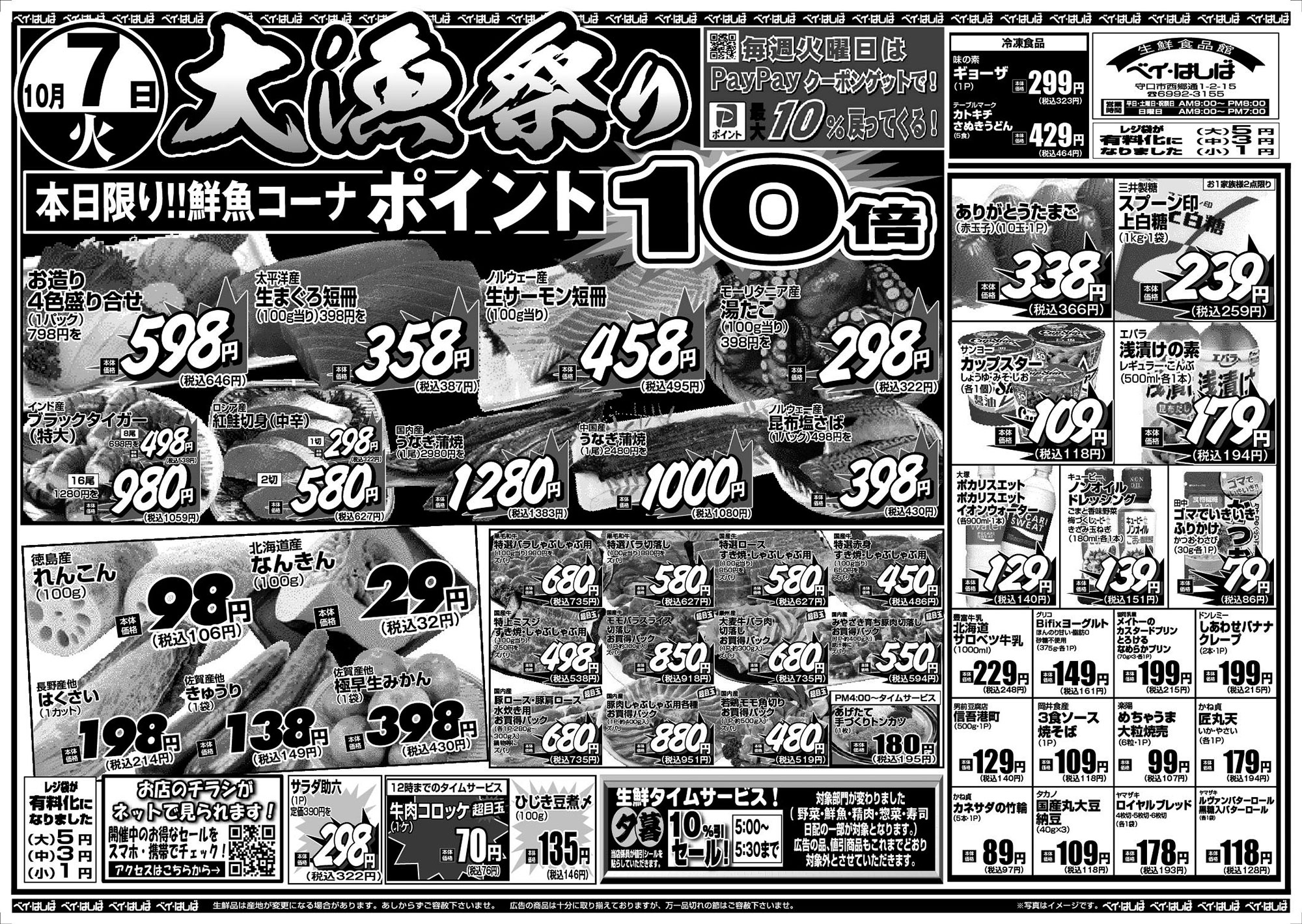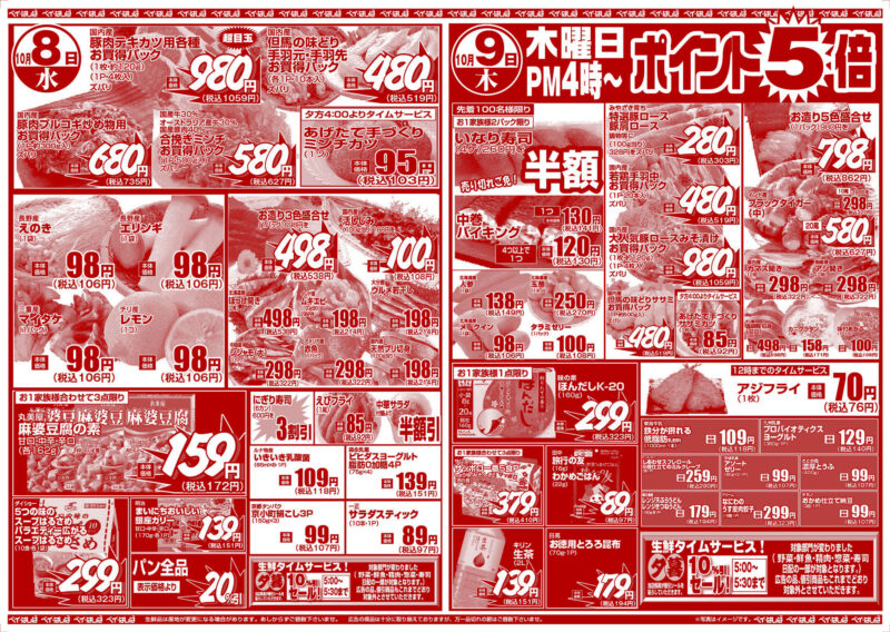 チラシ 今週のチラシ(2025年10月7日~10月9日) 投稿日:2025年10月5日 表面裏面 ※表面←→裏面を切り替えてご覧下さい。画像をクリックすると拡大表示になります。 ☆生鮮品は産地が変更になる場合があります。あしからずご容赦下さいませ。☆広告の商品は十分に取り揃えておりますが、万一品切れの節はご容赦下さいませ。※写真はイメージです。 -チラシ 執筆者:管理人