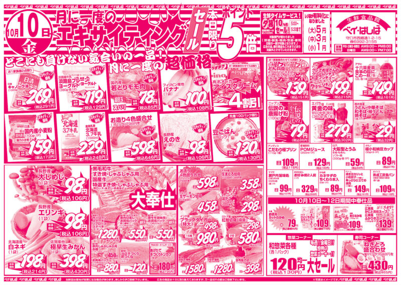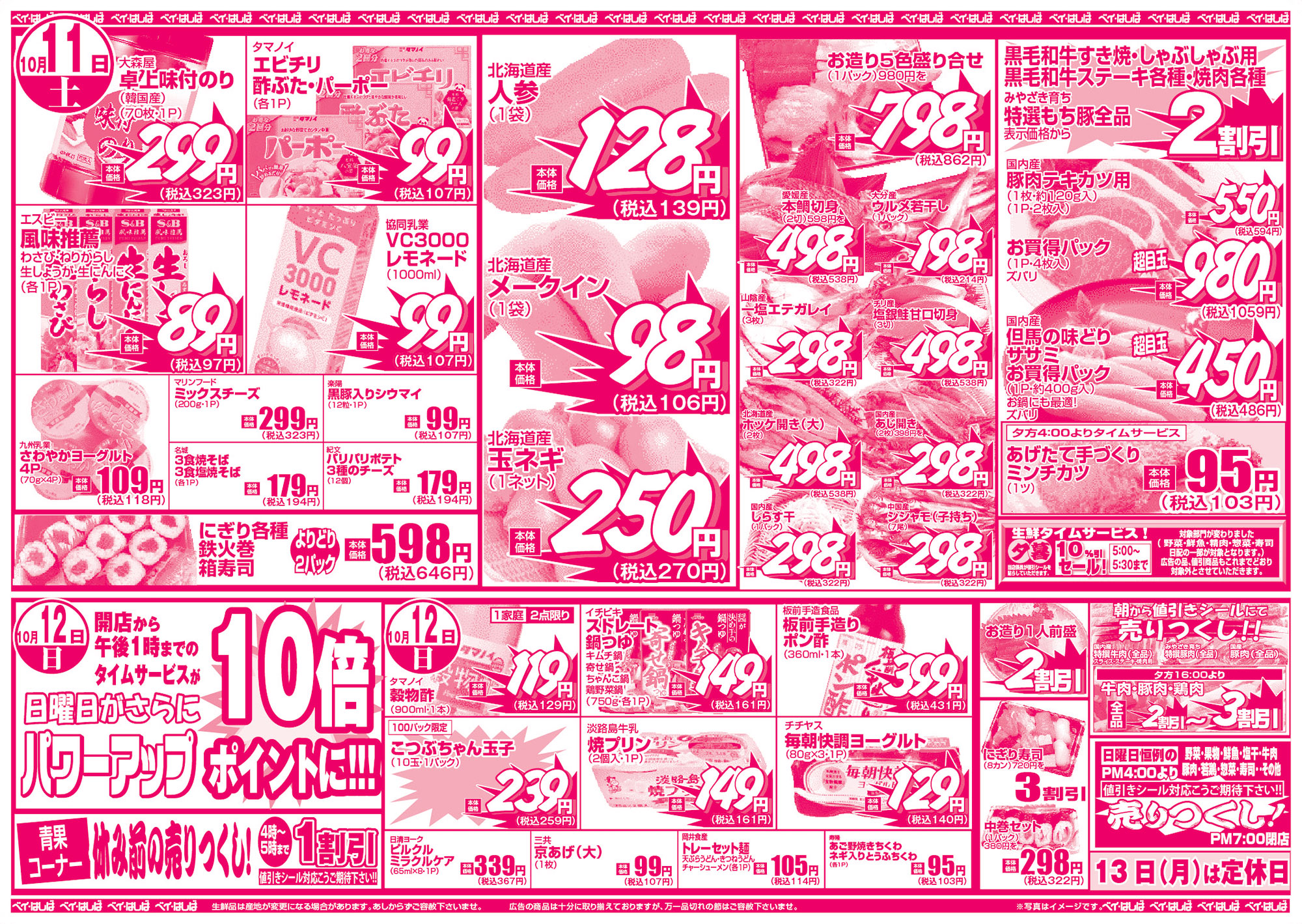 チラシ 今週のチラシ(2025年10月10日~10月12日) 投稿日:2025年10月9日 表面裏面 ※表面←→裏面を切り替えてご覧下さい。画像をクリックすると拡大表示になります。 ☆生鮮品は産地が変更になる場合があります。あしからずご容赦下さいませ。☆広告の商品は十分に取り揃えておりますが、万一品切れの節はご容赦下さいませ。※写真はイメージです。 -チラシ 執筆者:管理人