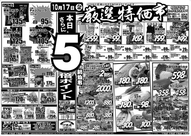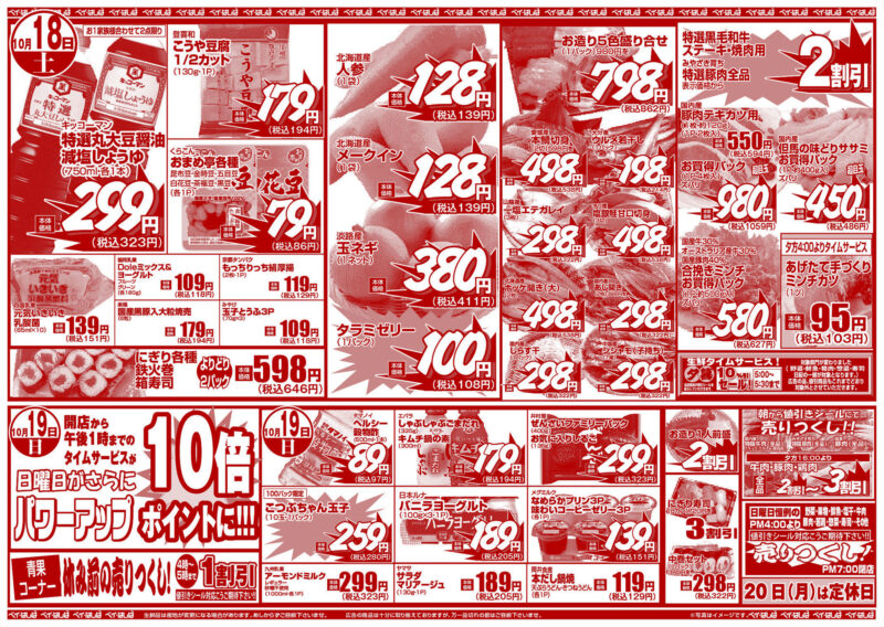 チラシ 今週のチラシ(2025年10月17日~10月19日) 投稿日:2025年10月16日 表面裏面 ※表面←→裏面を切り替えてご覧下さい。画像をクリックすると拡大表示になります。 ☆生鮮品は産地が変更になる場合があります。あしからずご容赦下さいませ。☆広告の商品は十分に取り揃えておりますが、万一品切れの節はご容赦下さいませ。※写真はイメージです。 -チラシ 執筆者:管理人