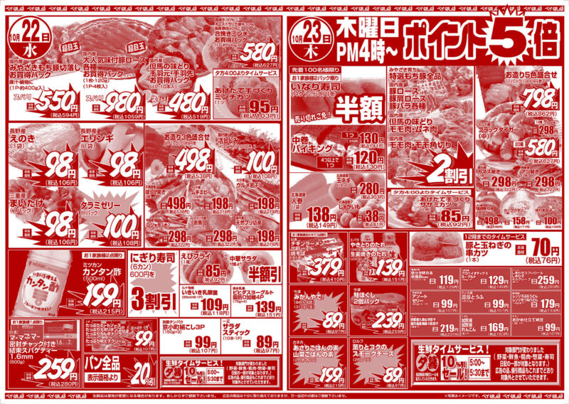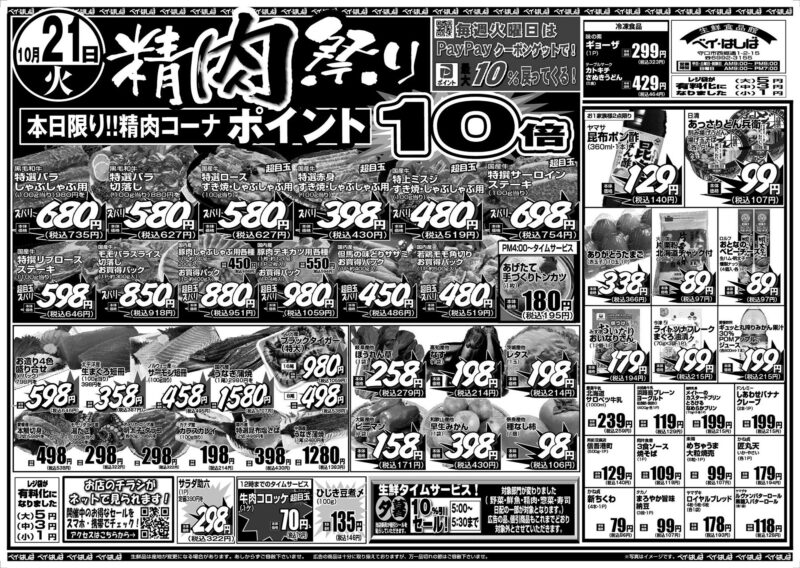 チラシ 今週のチラシ(2025年10月21日~10月23日) 投稿日:2025年10月19日 表面裏面 ※表面←→裏面を切り替えてご覧下さい。画像をクリックすると拡大表示になります。 ☆生鮮品は産地が変更になる場合があります。あしからずご容赦下さいませ。☆広告の商品は十分に取り揃えておりますが、万一品切れの節はご容赦下さいませ。※写真はイメージです。 -チラシ 執筆者:管理人