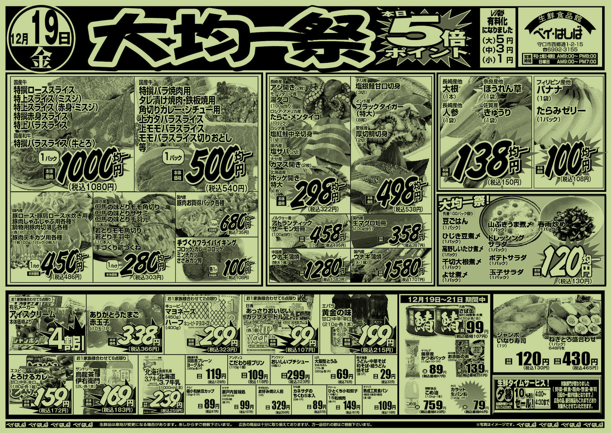 店舗情報 生鮮食品館 ベイ・はしば 守口市西郷通1-2-15 TEL. 6992-3155 営業時間 平日・土曜日・祝祭日:AM9:00~PM8:00 日曜日:AM9:00~PM7: