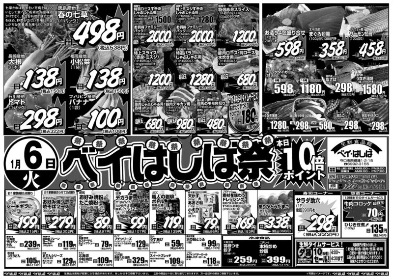 チラシ 今週のチラシ(2026年1月6日~1月8日) 投稿日:2026年1月5日 表面裏面 ※表面←→裏面を切り替えてご覧下さい。画像をクリックすると拡大表示になります。 ☆生鮮品は産地が変更になる場合があります。あしからずご容赦下さいませ。☆広告の商品は十分に取り揃えておりますが、万一品切れの節はご容赦下さいませ。※写真はイメージです。 -チラシ 執筆者:管理人