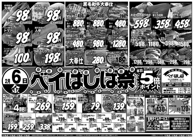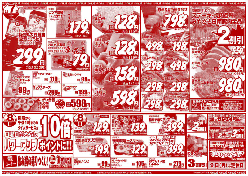 チラシ 今週のチラシ(2026年2月6日~2月8日) 投稿日:2026年2月5日 表面裏面 ※表面←→裏面を切り替えてご覧下さい。画像をクリックすると拡大表示になります。 ☆生鮮品は産地が変更になる場合があります。あしからずご容赦下さいませ。☆広告の商品は十分に取り揃えておりますが、万一品切れの節はご容赦下さいませ。※写真はイメージです。 -チラシ 執筆者:管理人