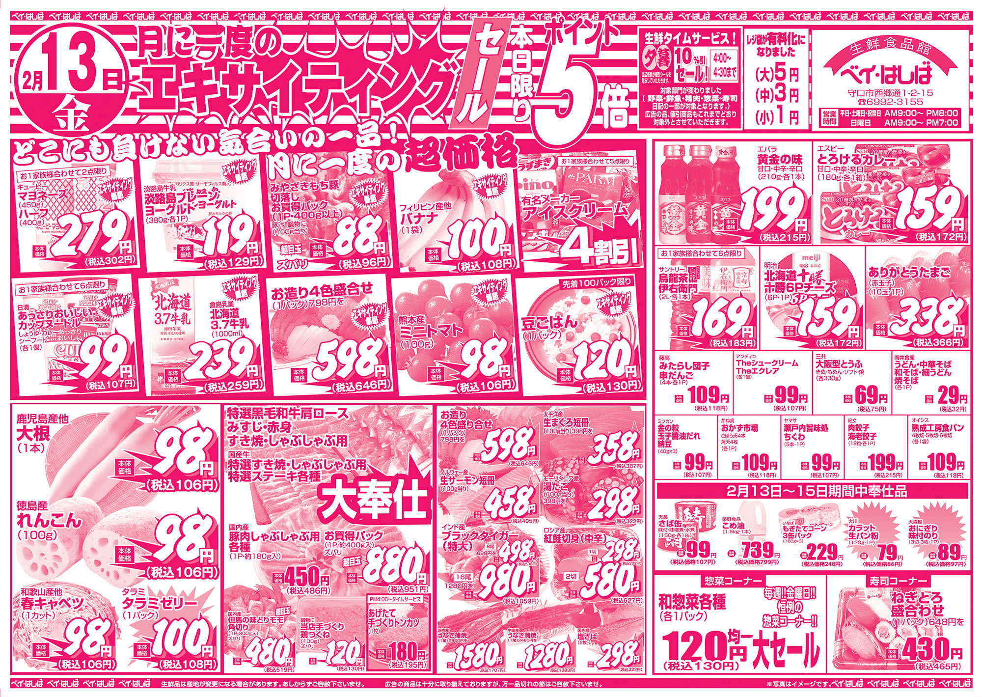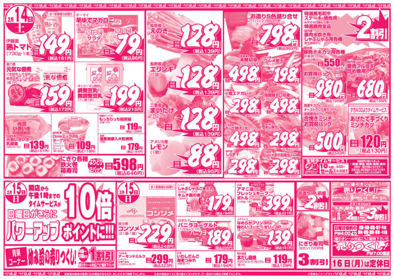チラシ 今週のチラシ(2026年2月13日~2月15日) 投稿日:2026年2月12日 表面裏面 ※表面←→裏面を切り替えてご覧下さい。画像をクリックすると拡大表示になります。 ☆生鮮品は産地が変更になる場合があります。あしからずご容赦下さいませ。☆広告の商品は十分に取り揃えておりますが、万一品切れの節はご容赦下さいませ。※写真はイメージです。 -チラシ 執筆者:管理人