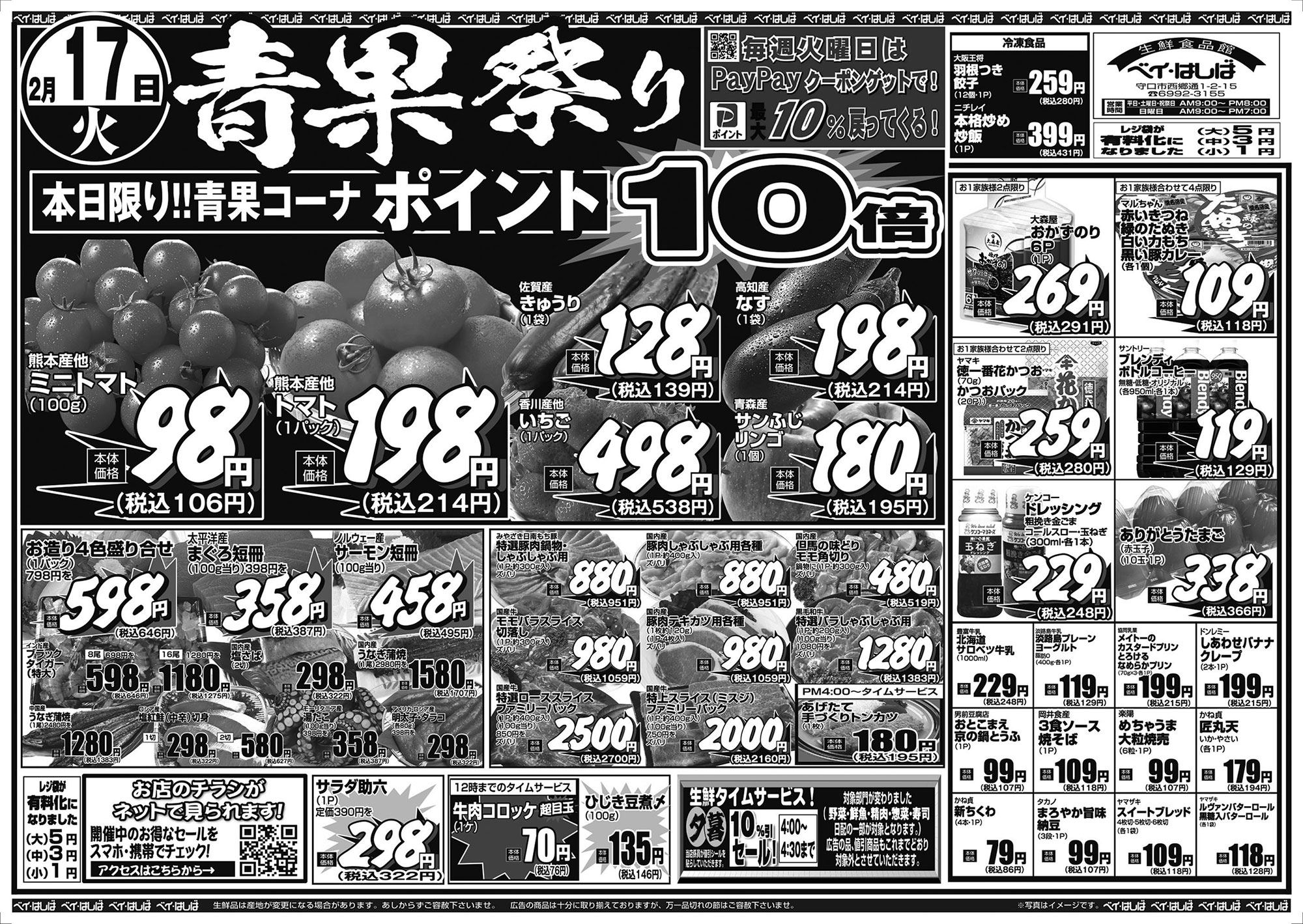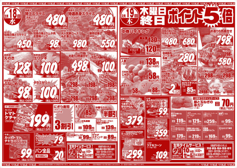 チラシ 今週のチラシ(2026年2月17日~2月19日) 投稿日:2026年2月15日 表面裏面 ※表面←→裏面を切り替えてご覧下さい。画像をクリックすると拡大表示になります。 ☆生鮮品は産地が変更になる場合があります。あしからずご容赦下さいませ。☆広告の商品は十分に取り揃えておりますが、万一品切れの節はご容赦下さいませ。※写真はイメージです。 -チラシ 執筆者:管理人