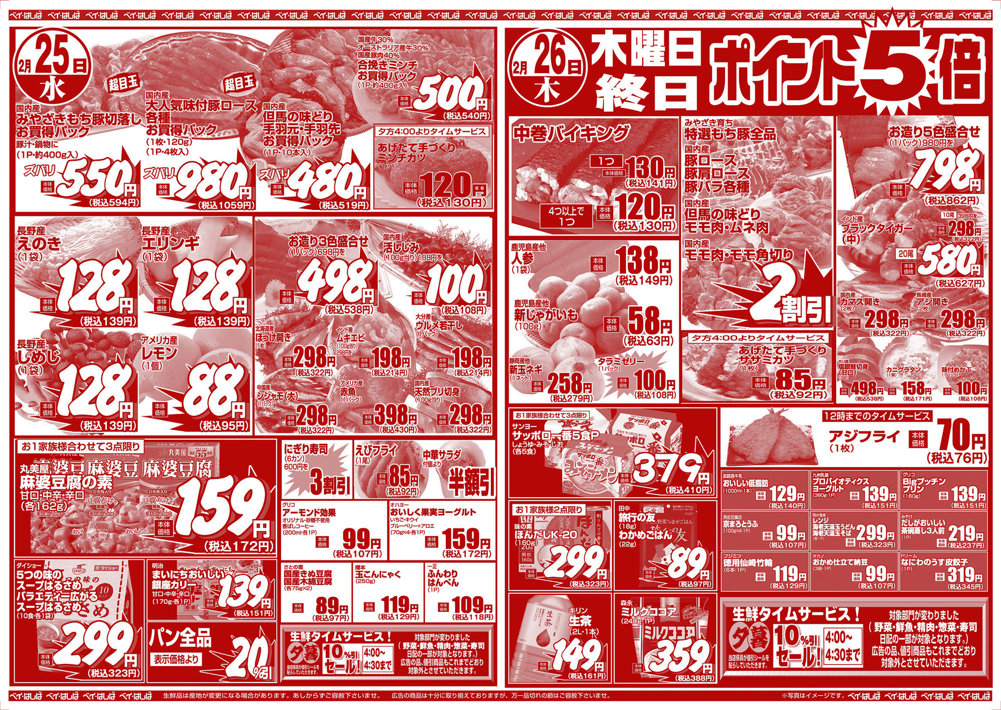 チラシ 今週のチラシ(2026年2月24日~2月26日) 投稿日:2026年2月22日 表面裏面 ※表面←→裏面を切り替えてご覧下さい。画像をクリックすると拡大表示になります。 ☆生鮮品は産地が変更になる場合があります。あしからずご容赦下さいませ。☆広告の商品は十分に取り揃えておりますが、万一品切れの節はご容赦下さいませ。※写真はイメージです。 -チラシ 執筆者:管理人