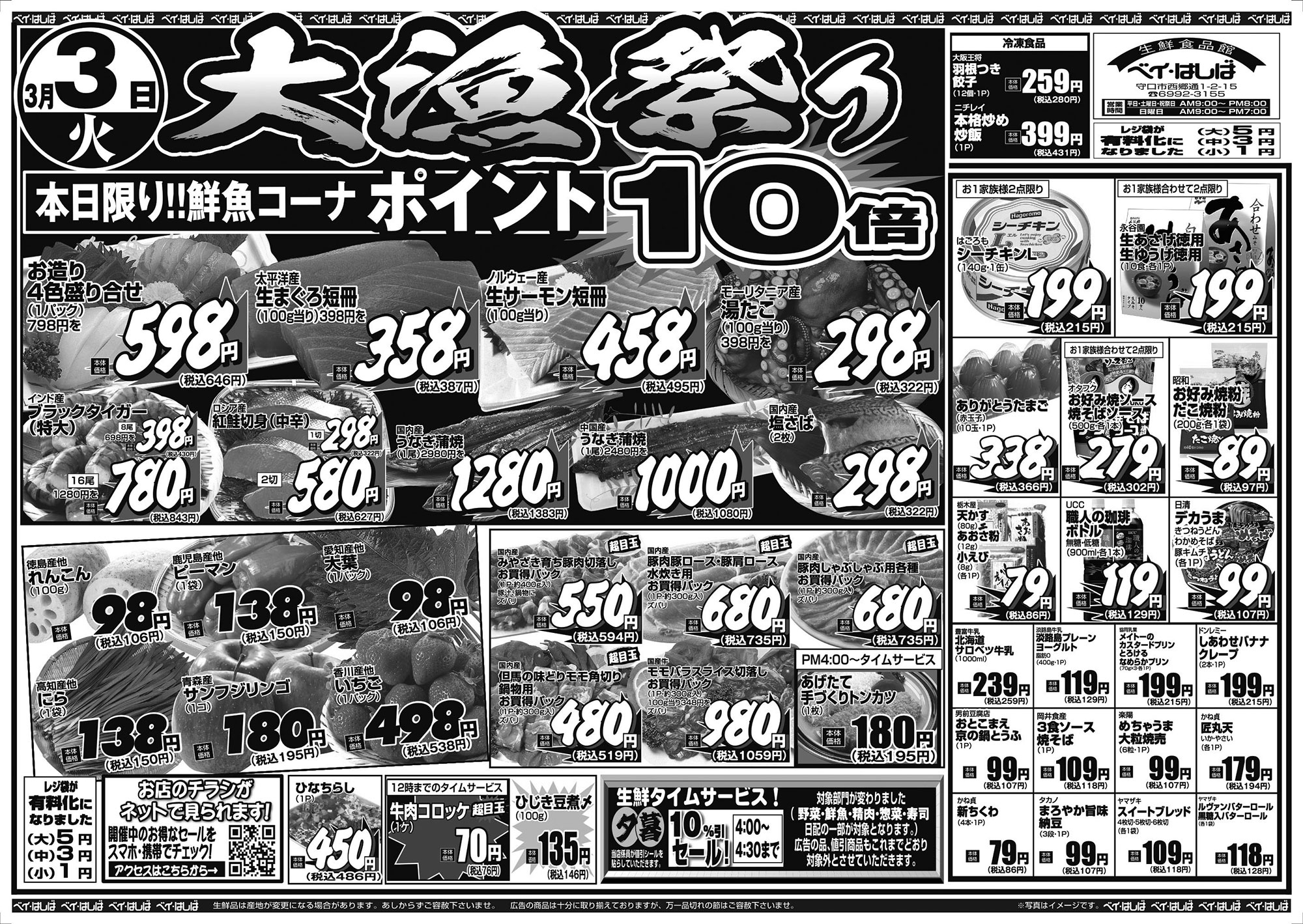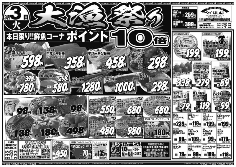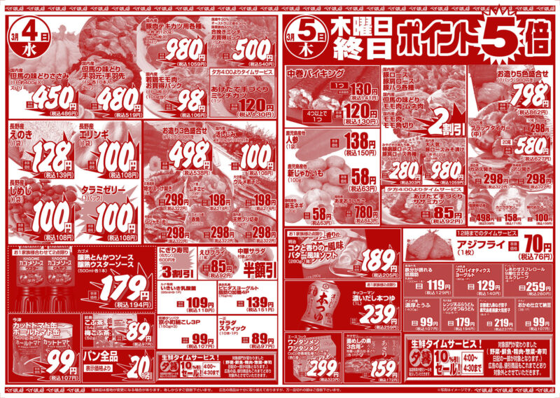 チラシ 今週のチラシ(2026年3月3日~3月5日) 投稿日:2026年3月1日 表面裏面 ※表面←→裏面を切り替えてご覧下さい。画像をクリックすると拡大表示になります。 ☆生鮮品は産地が変更になる場合があります。あしからずご容赦下さいませ。☆広告の商品は十分に取り揃えておりますが、万一品切れの節はご容赦下さいませ。※写真はイメージです。 -チラシ 執筆者:管理人