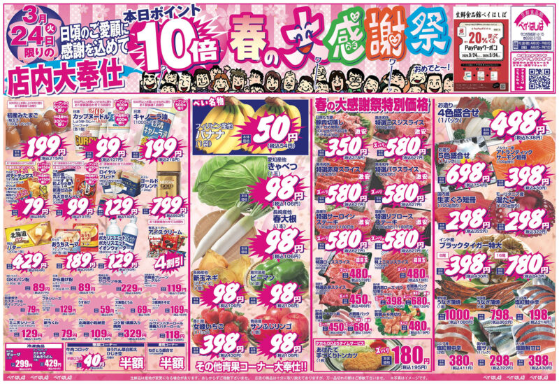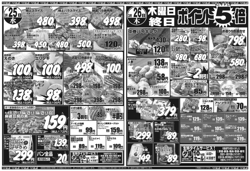 チラシ 今週のチラシ(2026年3月24日~3月26日) 投稿日:2026年3月22日 表面裏面 ※表面←→裏面を切り替えてご覧下さい。画像をクリックすると拡大表示になります。 ☆生鮮品は産地が変更になる場合があります。あしからずご容赦下さいませ。☆広告の商品は十分に取り揃えておりますが、万一品切れの節はご容赦下さいませ。※写真はイメージです。 -チラシ 執筆者:管理人
