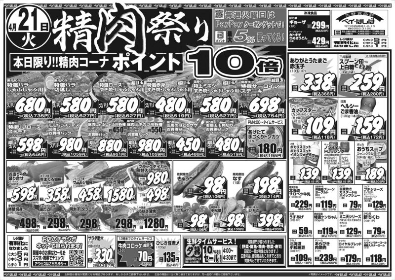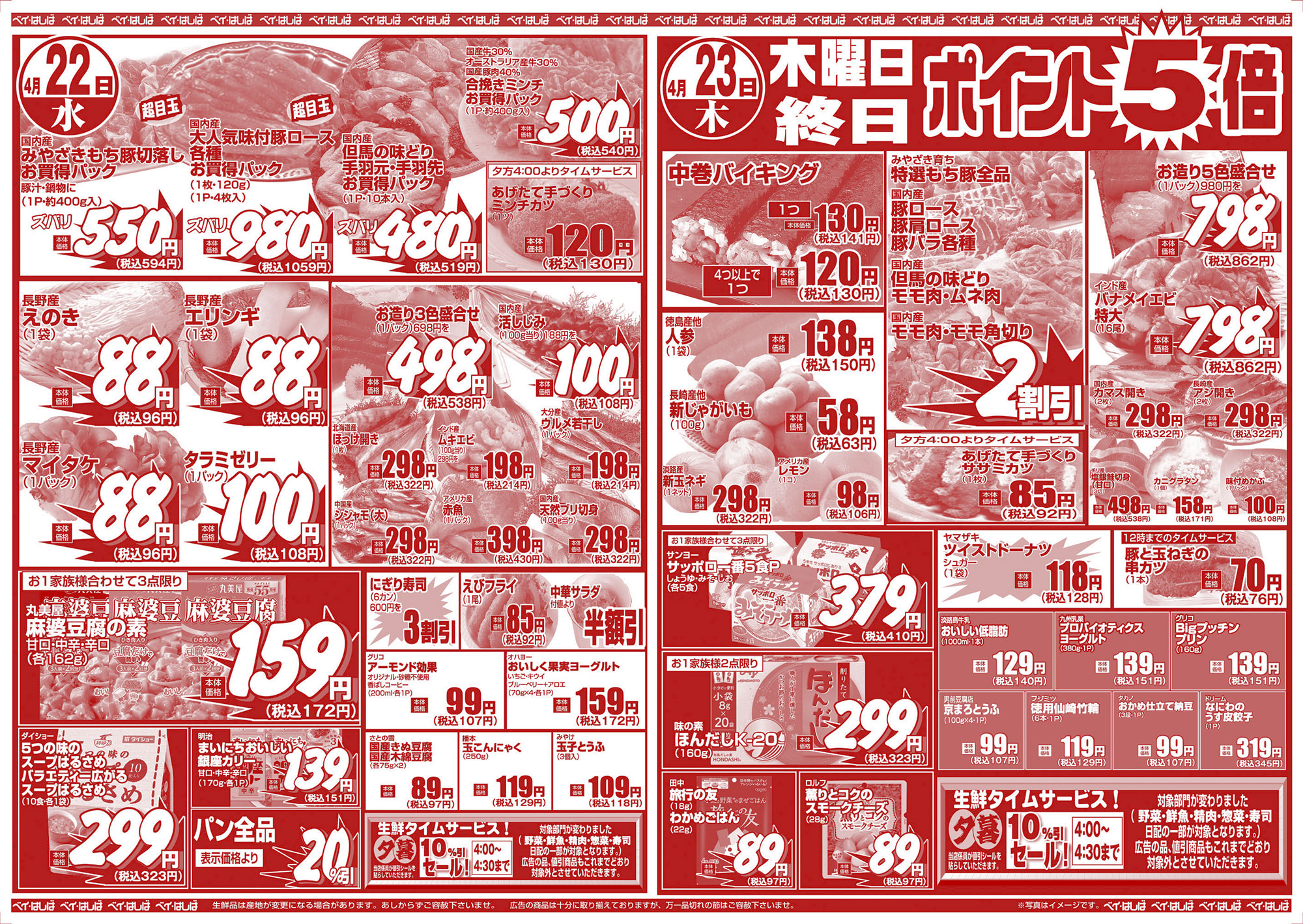 チラシ 今週のチラシ(2026年4月21日~4月23日) 投稿日:2026年4月19日 表面裏面 ※表面←→裏面を切り替えてご覧下さい。画像をクリックすると拡大表示になります。 ☆生鮮品は産地が変更になる場合があります。あしからずご容赦下さいませ。☆広告の商品は十分に取り揃えておりますが、万一品切れの節はご容赦下さいませ。※写真はイメージです。 -チラシ 執筆者:管理人